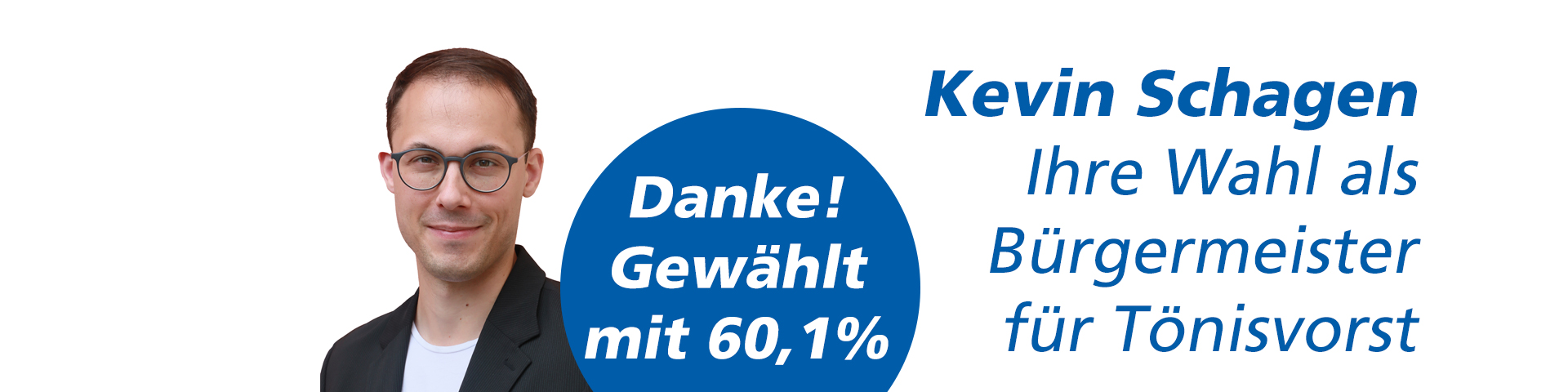 Mit 60,1 Prozent der Stimmen und Mehrheiten in allen Wahlkreisen hat Kevin Schagen einen bemerkenswerten Wahlsieg erzielt. Tönisvorst setzt damit ein klares Zeichen für frischen Wind im Rathaus.